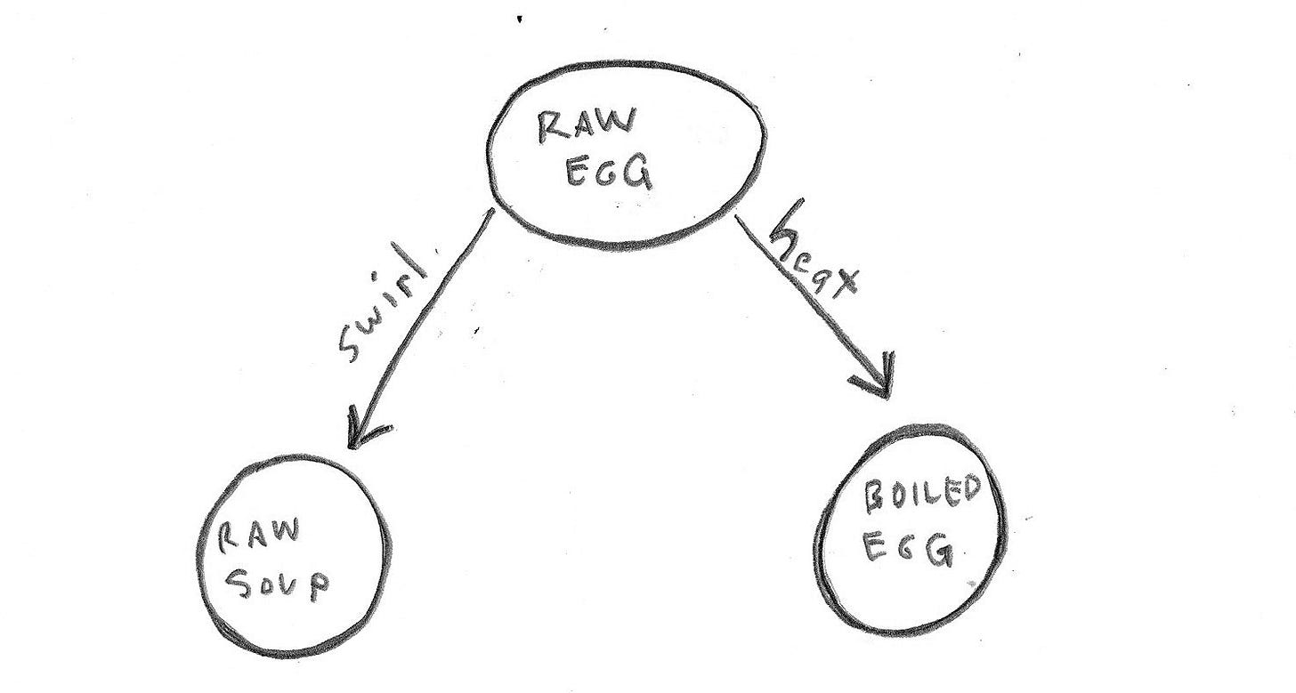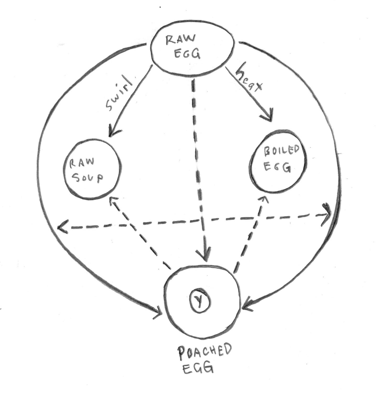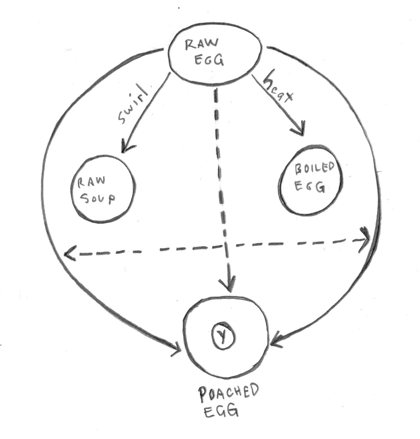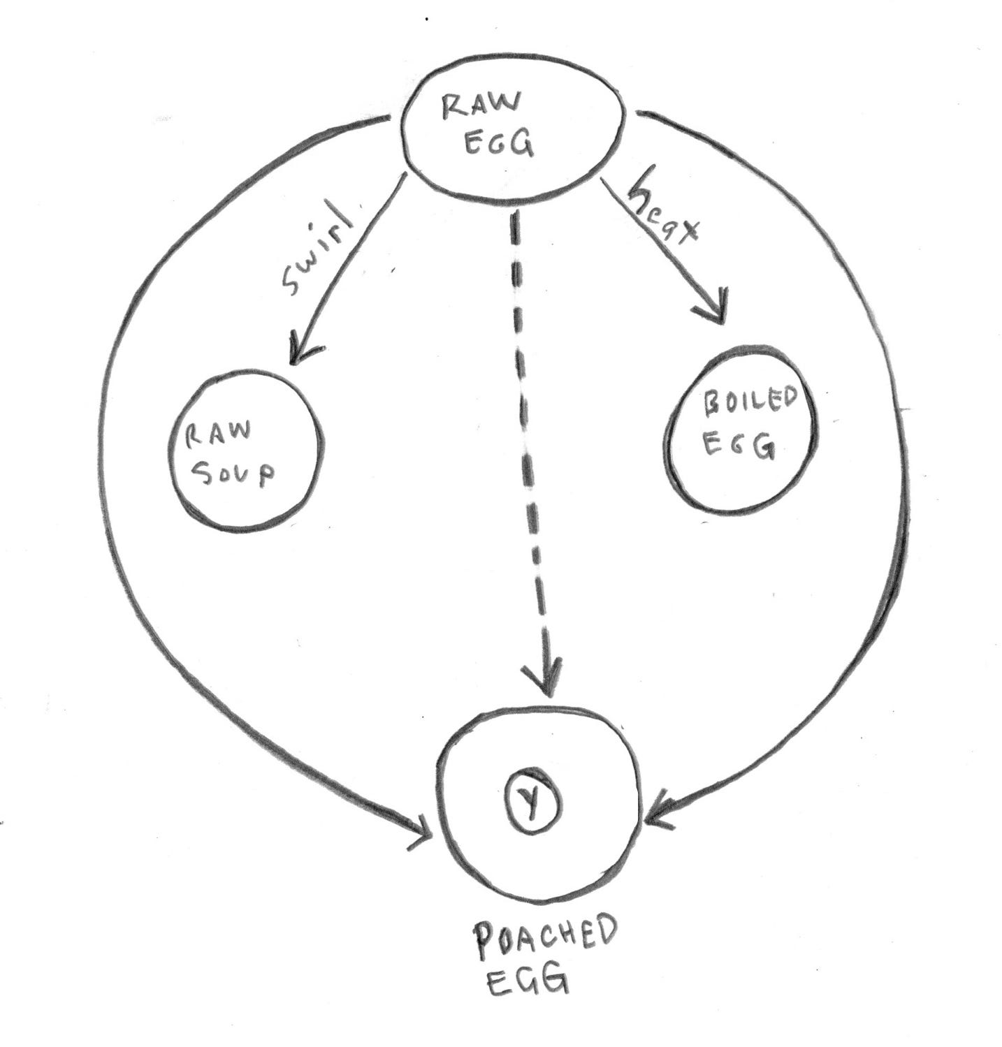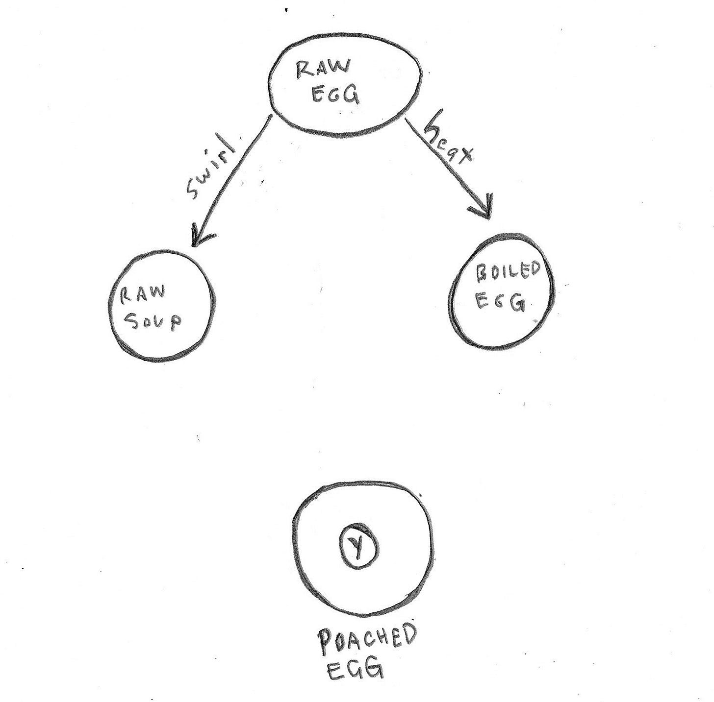 Rytius modified his diagram. “Remember, you can’t unpoach an egg, and you can’t cook an egg and then swirl it, or swirl it and then cook it. Poaching is a combination of the two, but you can’t factor either one out and get to a poached egg.”