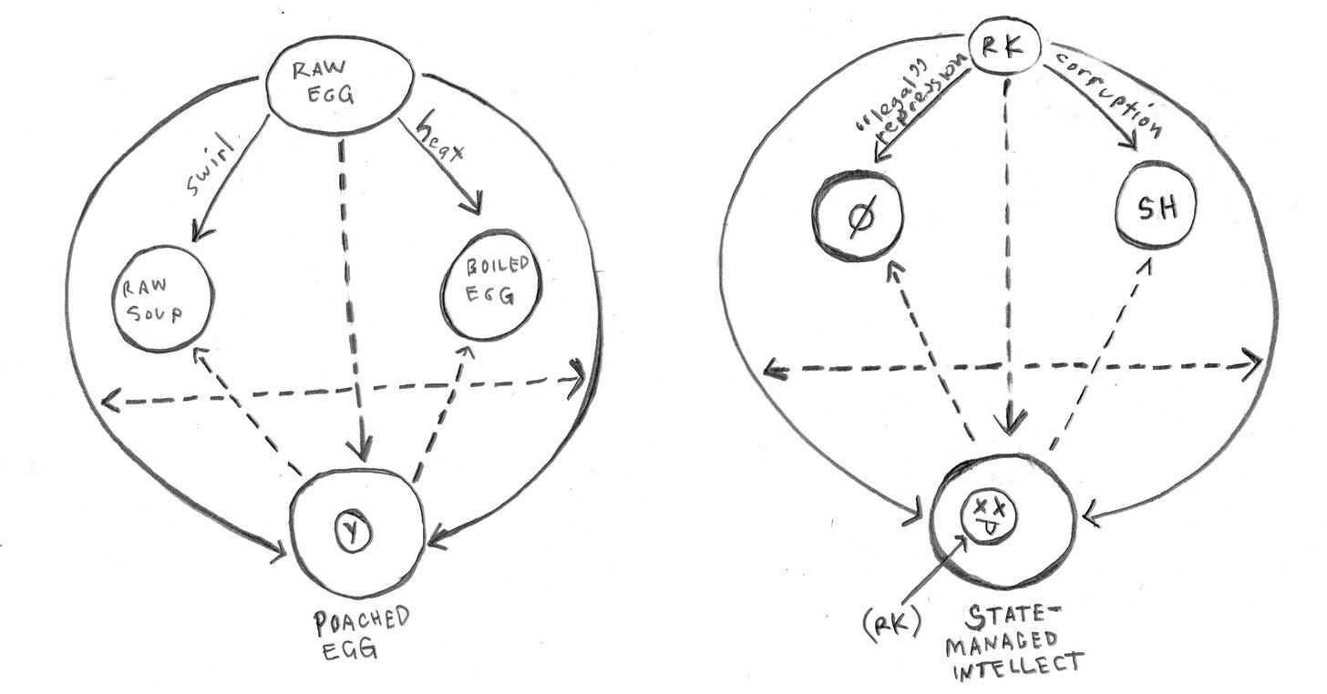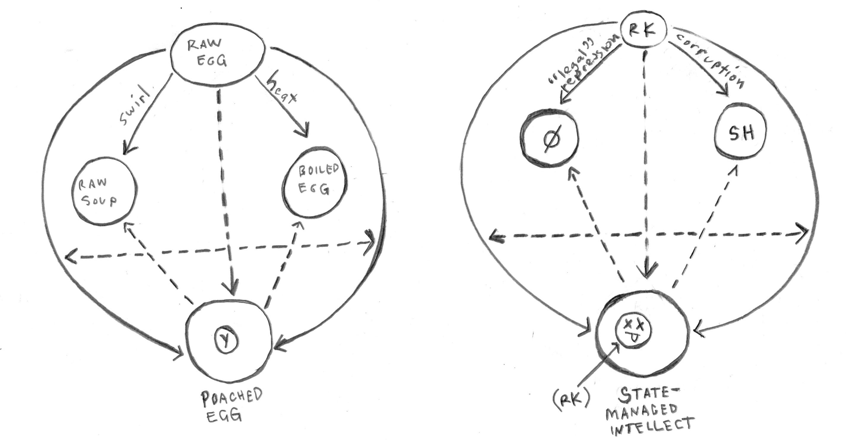 “But let’s look closely, please, at our metaphor and our situation. We have an egg swirling in hot water, slippy for a time, and as the water transmits its heat to those two, they set, locking into their final positions against one another, defined by one another. They can no longer change form, though they can be broken apart. But you have to have both the heat and the swirl simultaneously. That’s the only way to get to the poached egg.”